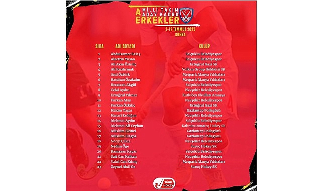 03-12 Temmuz 2025 tarihleri ortasında Konya’da yapılacak kamp öncesi A Ulusal Erkek Hokey Takımı’nın 23 kişilik aday takımı Türkiye Hokey Federasyonu tarafından açıklandı.